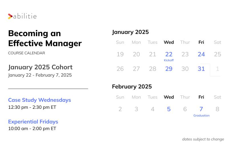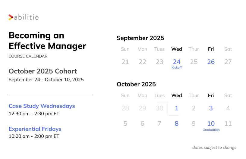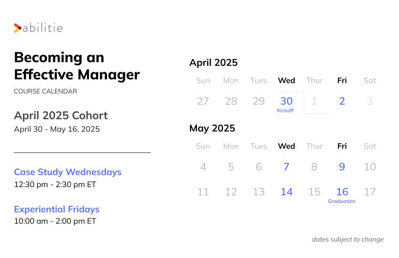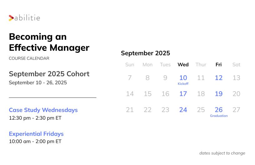 Becoming an Effective Manager is a core program of Abilitie, a world leader in executive leadership and business education. Over 100,000 learners across the world have gone through Abilitie’s award-winning leadership programs, including high-potential employees at companies such as Coca-Cola, GE, Nokia, Pfizer, and Southwest Airlines.