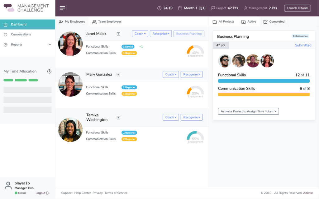 Through a blended curriculum, Abilitie’s Becoming An Effective Manager program provides a space for learners to better understand themselves and their role as a manager. The journey builds to simulated practice managing employees and delivering meaningful feedback before they make a critical mistake with a direct report.